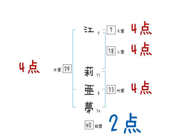 総運![]() | 江莉亜夢さんの総運は40画の2つ星!自信過剰で物事に固執するためトラブルに注意。 あなたの人生を表す1番重要な運勢です。生涯を通じて影響する総合運となり、主に50歳以降の晩年期に影響を及ぼします。 |