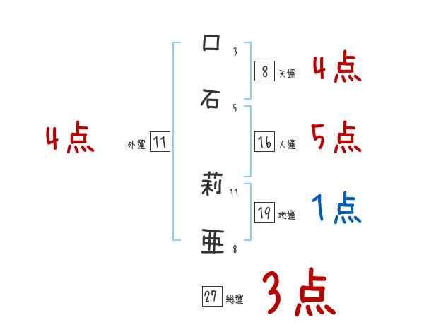 外運![]() | 口石莉亜さんの外運は11画の4つ星!着実に富や地位を得る幸運な人生。 生活面を象徴する運勢です。外部から受ける影響力を表し、結婚運、家庭運や職場、環境への順応性を表します。 |