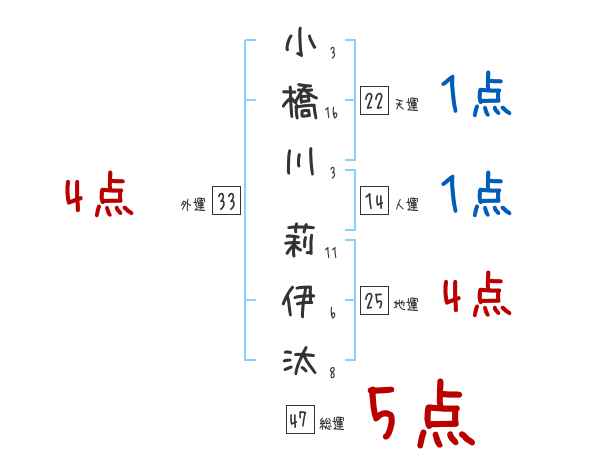 外運![]() | 小橋川莉伊汰さんの外運は33画の4つ星!権力志向でプライドが高い。勇気があり運を切り開き成功する。 生活面を象徴する運勢です。外部から受ける影響力を表し、結婚運、家庭運や職場、環境への順応性を表します。 |