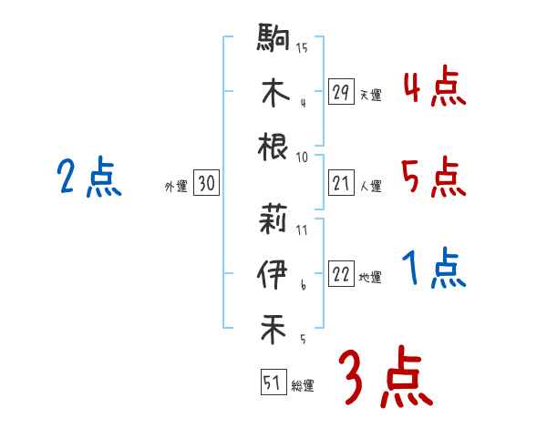 外運![]() | 駒木根莉伊禾さんの外運は30画の2つ星!浮き沈みの激しさに注意しましょう。 生活面を象徴する運勢です。外部から受ける影響力を表し、結婚運、家庭運や職場、環境への順応性を表します。 |