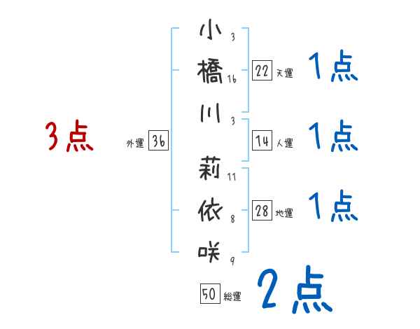 外運![]() | 小橋川莉依咲さんの外運は36画の3つ星!先見性が豊かです。多少神経質で苦労することも。 生活面を象徴する運勢です。外部から受ける影響力を表し、結婚運、家庭運や職場、環境への順応性を表します。 |