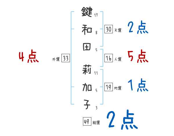天運![]() | 鍵和田莉加子さんの天運は30画の2つ星!浮き沈みの激しさに注意しましょう。 家系が持つ宿命的な運勢を表します。祖先から受け継いだ苗字ですので自分の力が及びません。家柄を象徴します。 |