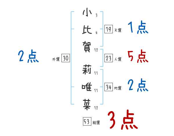 人運![]() | 小比賀莉唯菜さんの人運は23画の5つ星!想像力に優れ活力がある。一代で成功し名誉を手に入れる。 性格や才能などを表す2番目に重要な運勢です。人間関係や協調性、社会的な成功に影響します。主に20歳から50歳ぐらいまでの中年期の運勢を表します。 |