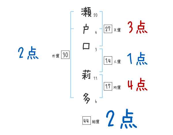 外運![]() | 瀬戸口莉多さんの外運は30画の2つ星!浮き沈みの激しさに注意しましょう。 生活面を象徴する運勢です。外部から受ける影響力を表し、結婚運、家庭運や職場、環境への順応性を表します。 |