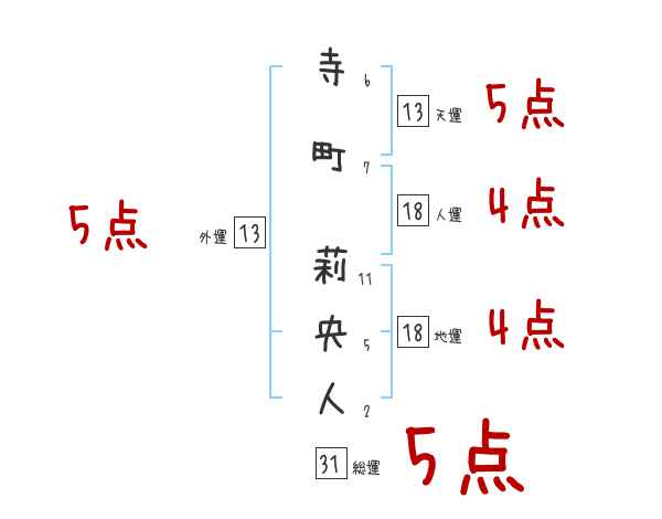 天運![]() | 寺町莉央人さんの天運は13画の5つ星!才能に恵まれ人気がある。名声を手に入れる。円満な人生。 家系が持つ宿命的な運勢を表します。祖先から受け継いだ苗字ですので自分の力が及びません。家柄を象徴します。 |