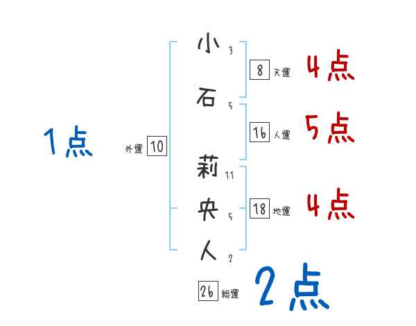 総運![]() | 小石莉央人さんの総運は26画の2つ星!波瀾万丈かも。信頼できる人を大事にしましょう。 あなたの人生を表す1番重要な運勢です。生涯を通じて影響する総合運となり、主に50歳以降の晩年期に影響を及ぼします。 |