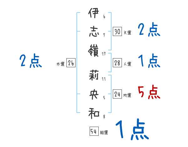 総運![]() | 伊志嶺莉央和さんの総運は54画の1つ星!トラブルが多いかも。周りをよく見て協調して過ごしましょう。 あなたの人生を表す1番重要な運勢です。生涯を通じて影響する総合運となり、主に50歳以降の晩年期に影響を及ぼします。 |