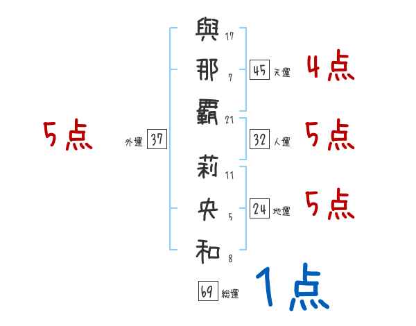 天運![]() | 與那覇莉央和さんの天運は45画の4つ星!もくもくと物事を進め達成する。地味な努力家。 家系が持つ宿命的な運勢を表します。祖先から受け継いだ苗字ですので自分の力が及びません。家柄を象徴します。 |