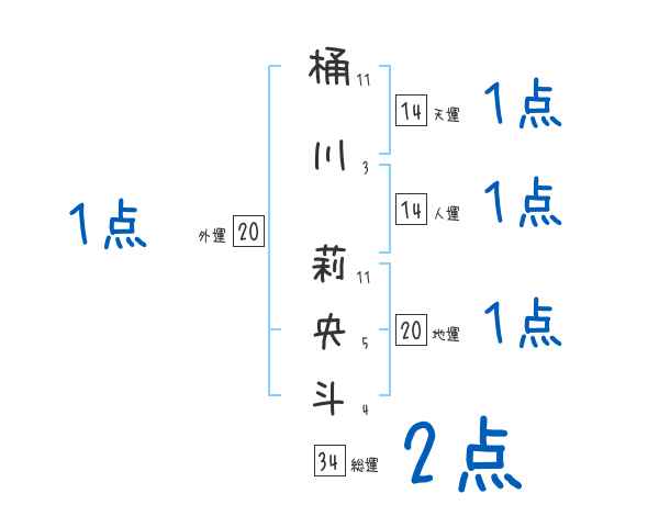 総運![]() | 桶川莉央斗さんの総運は34画の2つ星!独創性に優れるが、自尊心が強く災難に注意しましょう。 あなたの人生を表す1番重要な運勢です。生涯を通じて影響する総合運となり、主に50歳以降の晩年期に影響を及ぼします。 |
