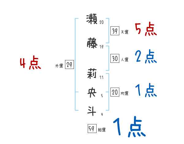 外運![]() | 瀬藤莉央斗さんの外運は29画の4つ星!完全主義で才能がある。厳格な心の持ち主。 生活面を象徴する運勢です。外部から受ける影響力を表し、結婚運、家庭運や職場、環境への順応性を表します。 |
