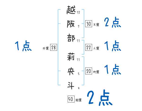 外運![]() | 越阪部莉央斗さんの外運は28画の1つ星!家庭環境に注意。スポーツで活躍できる能力があるかも。 生活面を象徴する運勢です。外部から受ける影響力を表し、結婚運、家庭運や職場、環境への順応性を表します。 |