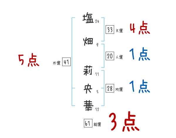 天運![]() | 塩畑莉央華さんの天運は33画の4つ星!権力志向でプライドが高い。勇気があり運を切り開き成功する。 家系が持つ宿命的な運勢を表します。祖先から受け継いだ苗字ですので自分の力が及びません。家柄を象徴します。 |