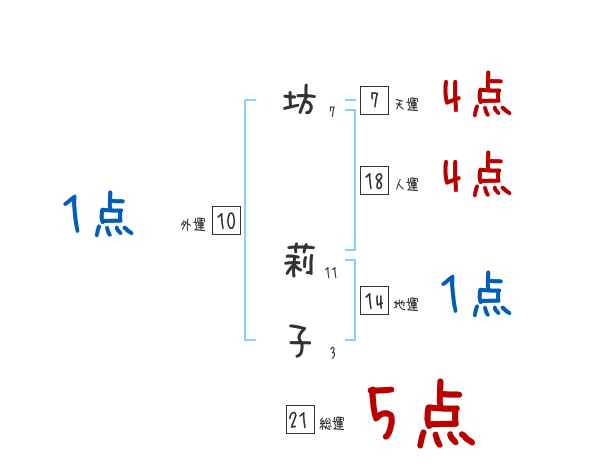 天運![]() | 坊莉子さんの天運は7画の4つ星!強い意志や信念を持ち独立心が強い。自立する。 家系が持つ宿命的な運勢を表します。祖先から受け継いだ苗字ですので自分の力が及びません。家柄を象徴します。 |