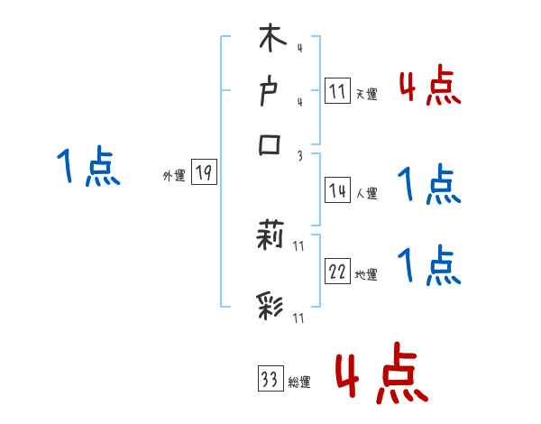 天運![]() | 木戸口莉彩さんの天運は11画の4つ星!着実に富や地位を得る幸運な人生。 家系が持つ宿命的な運勢を表します。祖先から受け継いだ苗字ですので自分の力が及びません。家柄を象徴します。 |
