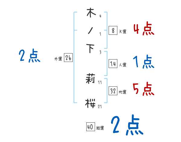 外運![]() | 木ノ下莉桜さんの外運は26画の2つ星!波瀾万丈かも。信頼できる人を大事にしましょう。 生活面を象徴する運勢です。外部から受ける影響力を表し、結婚運、家庭運や職場、環境への順応性を表します。 |