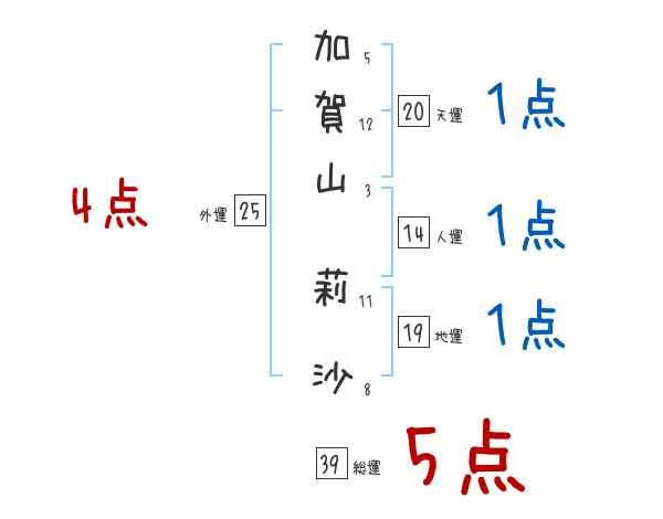 総運![]() | 加賀山莉沙さんの総運は39画の5つ星!社交性に優れ人望が厚い。人の上に立ち成功する。 あなたの人生を表す1番重要な運勢です。生涯を通じて影響する総合運となり、主に50歳以降の晩年期に影響を及ぼします。 |