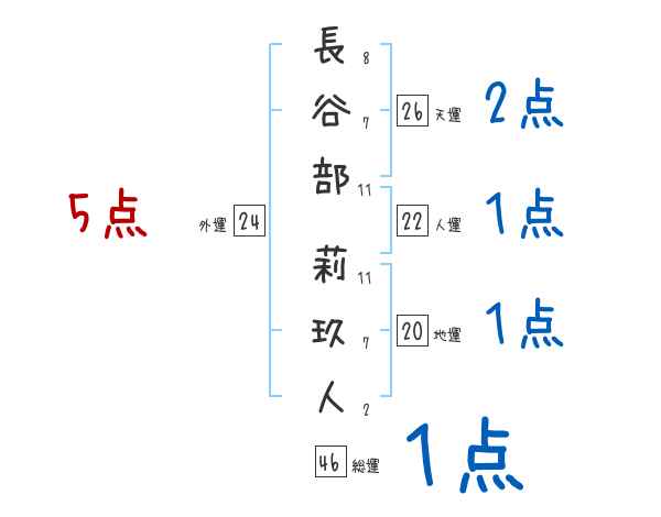 天運![]() | 長谷部莉玖人さんの天運は26画の2つ星!波瀾万丈かも。信頼できる人を大事にしましょう。 家系が持つ宿命的な運勢を表します。祖先から受け継いだ苗字ですので自分の力が及びません。家柄を象徴します。 |