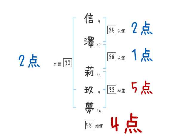 総運![]() | 信澤莉玖夢さんの総運は58画の4つ星!安定した生活。大器晩成タイプ。 あなたの人生を表す1番重要な運勢です。生涯を通じて影響する総合運となり、主に50歳以降の晩年期に影響を及ぼします。 |