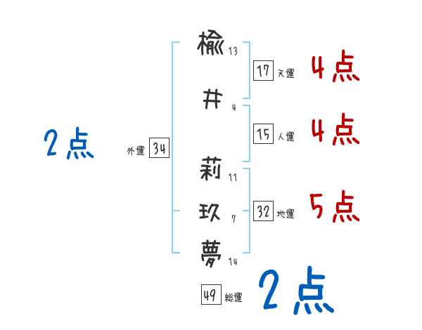 人運![]() | 楡井莉玖夢さんの人運は15画の4つ星!人徳があり出世する。順調に物事を進め円満な人生。 性格や才能などを表す2番目に重要な運勢です。人間関係や協調性、社会的な成功に影響します。主に20歳から50歳ぐらいまでの中年期の運勢を表します。 |