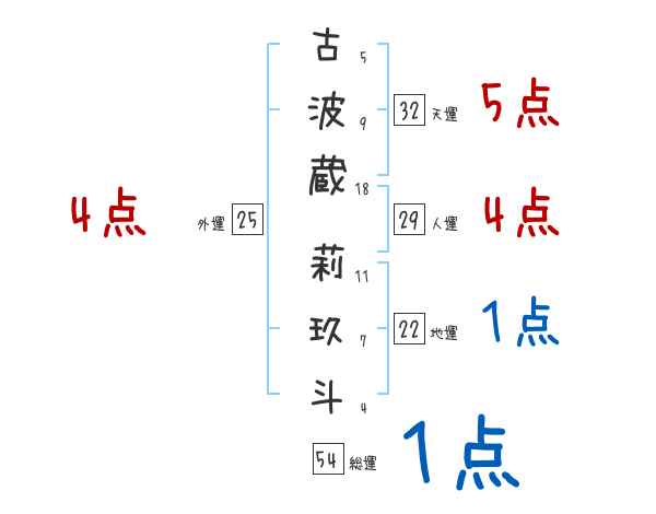 天運![]() | 古波蔵莉玖斗さんの天運は32画の5つ星!柔軟性があり成功する。チャンスが多く金運が良い。 家系が持つ宿命的な運勢を表します。祖先から受け継いだ苗字ですので自分の力が及びません。家柄を象徴します。 |
