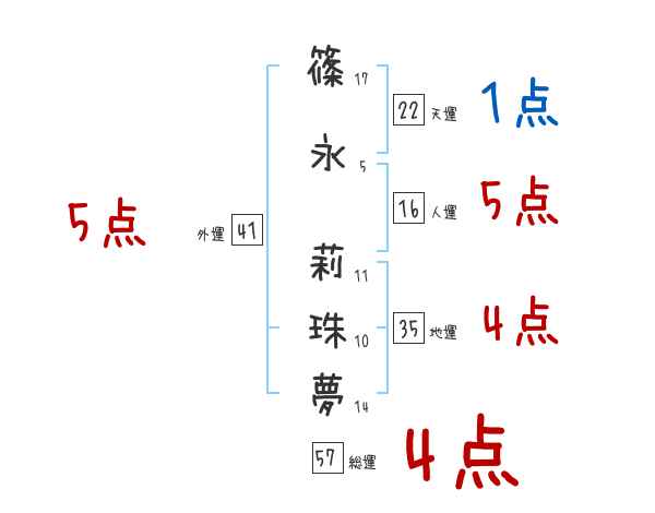 人運![]() | 篠永莉珠夢さんの人運は16画の5つ星!人望が厚く大きく発展する。逆転成功が見える。 性格や才能などを表す2番目に重要な運勢です。人間関係や協調性、社会的な成功に影響します。主に20歳から50歳ぐらいまでの中年期の運勢を表します。 |