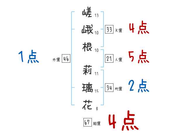 嵯峨根莉璃花さんの総運は67画の4つ星