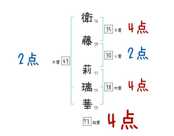 天運![]() | 衛藤莉璃華さんの天運は35画の4つ星!温厚な性格で感受性が高い。穏和な性格で人望が厚い。 家系が持つ宿命的な運勢を表します。祖先から受け継いだ苗字ですので自分の力が及びません。家柄を象徴します。 |