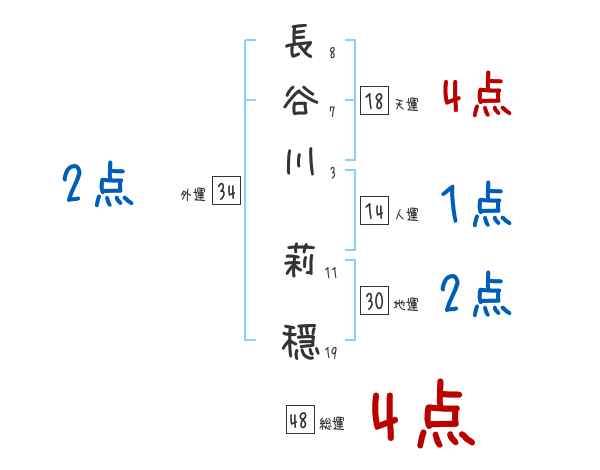 外運![]() | 長谷川莉穏さんの外運は34画の2つ星!独創性に優れるが、自尊心が強く災難に注意しましょう。 生活面を象徴する運勢です。外部から受ける影響力を表し、結婚運、家庭運や職場、環境への順応性を表します。 |
