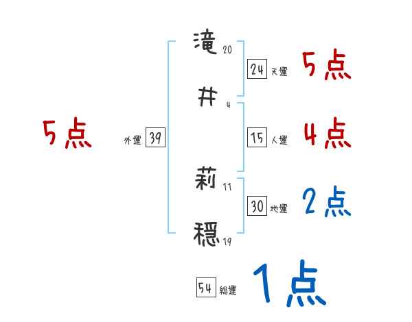 外運![]() | 滝井莉穏さんの外運は39画の5つ星!社交性に優れ人望が厚い。人の上に立ち成功する。 生活面を象徴する運勢です。外部から受ける影響力を表し、結婚運、家庭運や職場、環境への順応性を表します。 |