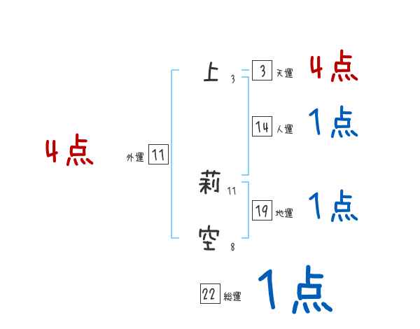 天運![]() | 上莉空さんの天運は3画の4つ星!活動的で才能に恵まれ、多くの信頼を得る。希望に満ち成長する。 家系が持つ宿命的な運勢を表します。祖先から受け継いだ苗字ですので自分の力が及びません。家柄を象徴します。 |
