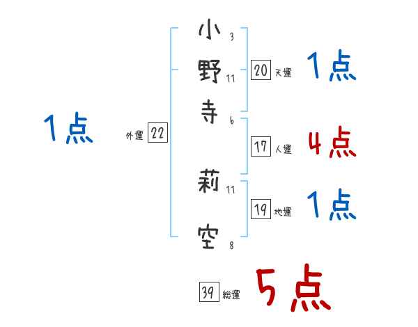 外運![]() | 小野寺莉空さんの外運は22画の1つ星!努力することが苦手ないっぽう手先が器用。芸術性にも優れる。 生活面を象徴する運勢です。外部から受ける影響力を表し、結婚運、家庭運や職場、環境への順応性を表します。 |
