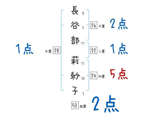 天運![]() | 長谷部莉紗子さんの天運は26画の2つ星!波瀾万丈かも。信頼できる人を大事にしましょう。 家系が持つ宿命的な運勢を表します。祖先から受け継いだ苗字ですので自分の力が及びません。家柄を象徴します。 |