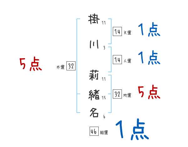 天運![]() | 掛川莉緒名さんの天運は14画の1つ星!人に対して優しいがストレスを溜め込みがち。人間関係のトラブルを避けるよう気をつけましょう。 家系が持つ宿命的な運勢を表します。祖先から受け継いだ苗字ですので自分の力が及びません。家柄を象徴します。 |