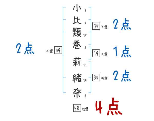 人運![]() | 小比類巻莉緒奈さんの人運は19画の1つ星!優れた才能を持ちますが、協調性が足りないことも。周りの人と協力する事を意識しましょう。 性格や才能などを表す2番目に重要な運勢です。人間関係や協調性、社会的な成功に影響します。主に20歳から50歳ぐらいまでの中年期の運勢を表します。 |