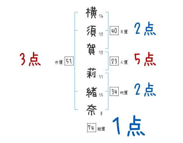 外運![]() | 横須賀莉緒奈さんの外運は51画の3つ星!変化が激しく、危険に注意。堅実な性格。 生活面を象徴する運勢です。外部から受ける影響力を表し、結婚運、家庭運や職場、環境への順応性を表します。 |