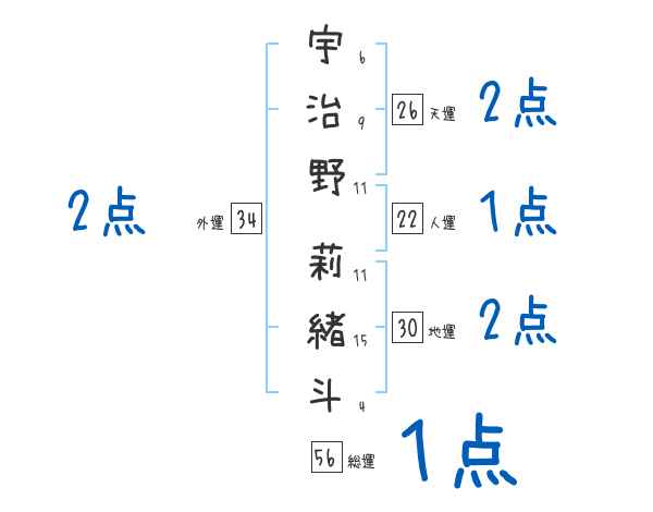 総運![]() | 宇治野莉緒斗さんの総運は56画の1つ星!消極的で無気力になりがち。誠実な気持ちが必要でしょう。 あなたの人生を表す1番重要な運勢です。生涯を通じて影響する総合運となり、主に50歳以降の晩年期に影響を及ぼします。 |