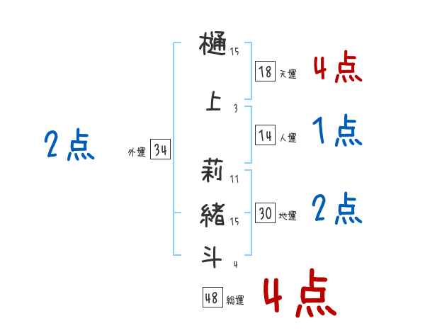 外運![]() | 樋上莉緒斗さんの外運は34画の2つ星!独創性に優れるが、自尊心が強く災難に注意しましょう。 生活面を象徴する運勢です。外部から受ける影響力を表し、結婚運、家庭運や職場、環境への順応性を表します。 |
