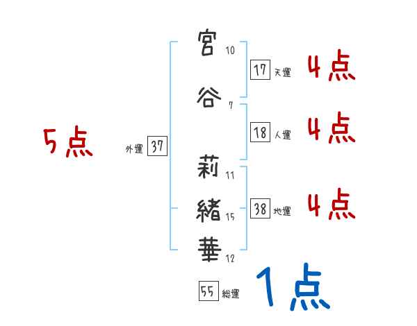 天運![]() | 宮谷莉緒華さんの天運は17画の4つ星!積極的な行動力。地位を気づき財産を手に入れる。純粋な心と直感力。 家系が持つ宿命的な運勢を表します。祖先から受け継いだ苗字ですので自分の力が及びません。家柄を象徴します。 |