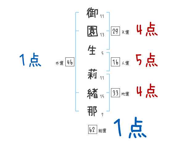 人運![]() | 御園生莉緒那さんの人運は16画の5つ星!人望が厚く大きく発展する。逆転成功が見える。 性格や才能などを表す2番目に重要な運勢です。人間関係や協調性、社会的な成功に影響します。主に20歳から50歳ぐらいまでの中年期の運勢を表します。 |