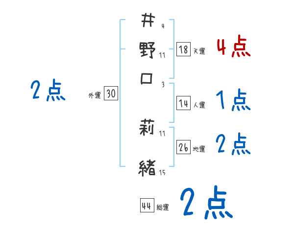 総運![]() | 井野口莉緒さんの総運は44画の2つ星!誠実で慎重な性格。物事を考えすぎないように注意しましょう。 あなたの人生を表す1番重要な運勢です。生涯を通じて影響する総合運となり、主に50歳以降の晩年期に影響を及ぼします。 |
