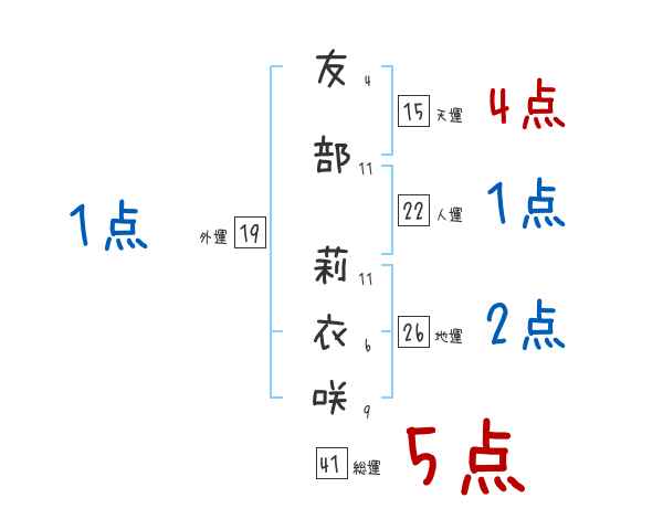 外運![]() | 友部莉衣咲さんの外運は19画の1つ星!優れた才能を持ちますが、協調性が足りないことも。周りの人と協力する事を意識しましょう。 生活面を象徴する運勢です。外部から受ける影響力を表し、結婚運、家庭運や職場、環境への順応性を表します。 |