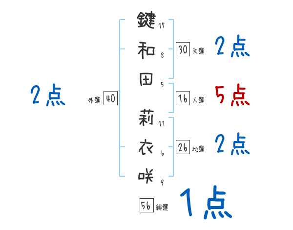 総運![]() | 鍵和田莉衣咲さんの総運は56画の1つ星!消極的で無気力になりがち。誠実な気持ちが必要でしょう。 あなたの人生を表す1番重要な運勢です。生涯を通じて影響する総合運となり、主に50歳以降の晩年期に影響を及ぼします。 |