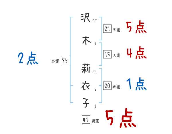 外運![]() | 沢木莉衣子さんの外運は26画の2つ星!波瀾万丈かも。信頼できる人を大事にしましょう。 生活面を象徴する運勢です。外部から受ける影響力を表し、結婚運、家庭運や職場、環境への順応性を表します。 |