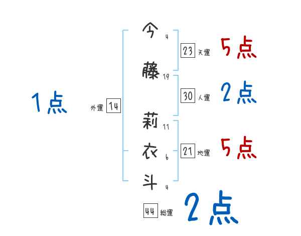 天運![]() | 今藤莉衣斗さんの天運は23画の5つ星!想像力に優れ活力がある。一代で成功し名誉を手に入れる。 家系が持つ宿命的な運勢を表します。祖先から受け継いだ苗字ですので自分の力が及びません。家柄を象徴します。 |