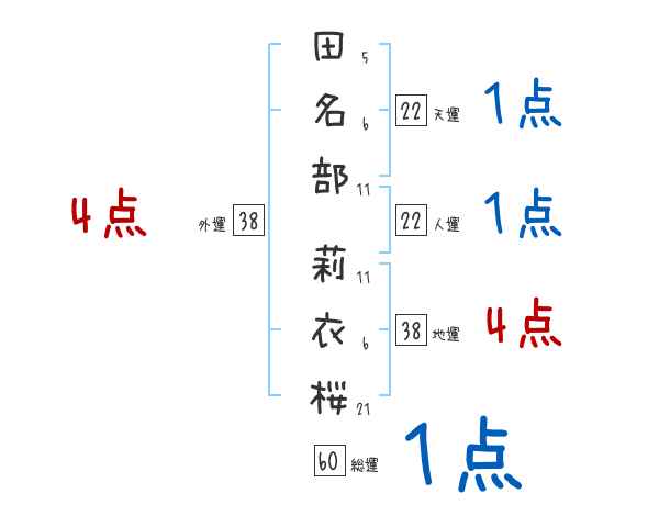 天運![]() | 田名部莉衣桜さんの天運は22画の1つ星!努力することが苦手ないっぽう手先が器用。芸術性にも優れる。 家系が持つ宿命的な運勢を表します。祖先から受け継いだ苗字ですので自分の力が及びません。家柄を象徴します。 |