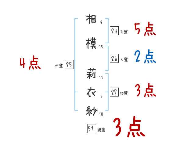 天運![]() | 相模莉衣紗さんの天運は24画の5つ星!家庭運が良く順調な人生。金運にも恵まれる。 家系が持つ宿命的な運勢を表します。祖先から受け継いだ苗字ですので自分の力が及びません。家柄を象徴します。 |