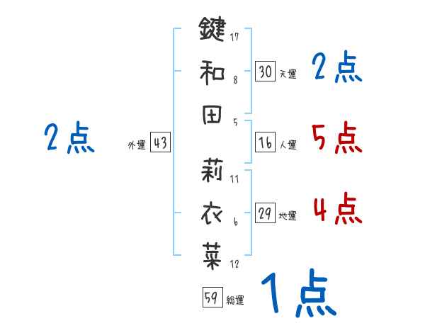 人運![]() | 鍵和田莉衣菜さんの人運は16画の5つ星!人望が厚く大きく発展する。逆転成功が見える。 性格や才能などを表す2番目に重要な運勢です。人間関係や協調性、社会的な成功に影響します。主に20歳から50歳ぐらいまでの中年期の運勢を表します。 |
