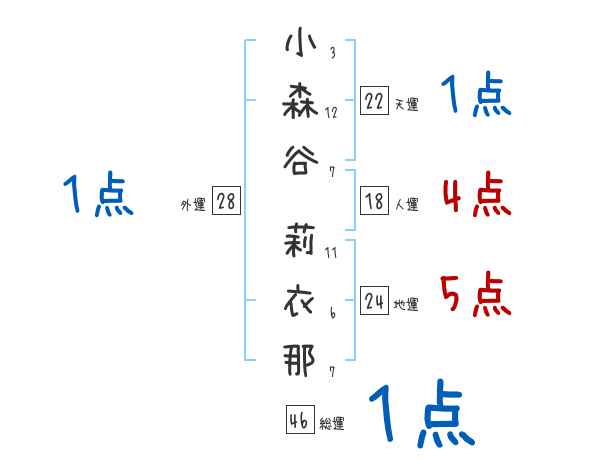 総運![]() | 小森谷莉衣那さんの総運は46画の1つ星!迷走することが多く苦労するかも。目先のことにとらわれないように。 あなたの人生を表す1番重要な運勢です。生涯を通じて影響する総合運となり、主に50歳以降の晩年期に影響を及ぼします。 |
