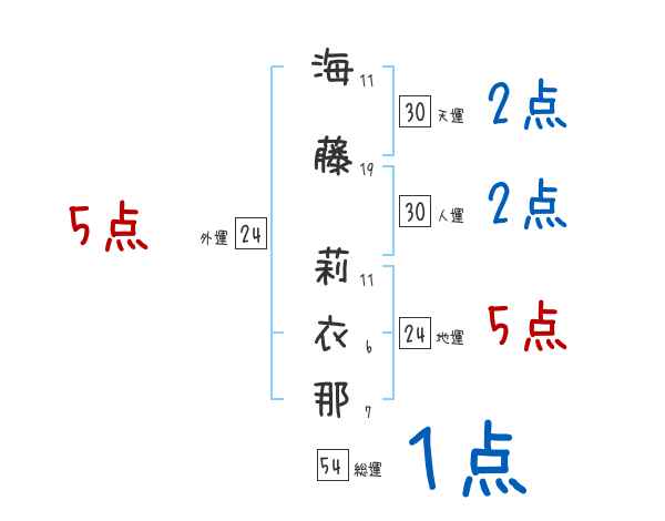外運![]() | 海藤莉衣那さんの外運は24画の5つ星!家庭運が良く順調な人生。金運にも恵まれる。 生活面を象徴する運勢です。外部から受ける影響力を表し、結婚運、家庭運や職場、環境への順応性を表します。 |