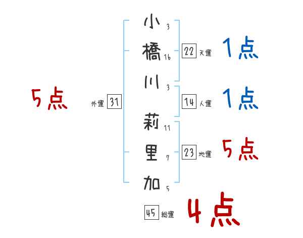 外運![]() | 小橋川莉里加さんの外運は31画の5つ星!社交性があり判断力に優れる。順風満帆な人生で円満な生活。 生活面を象徴する運勢です。外部から受ける影響力を表し、結婚運、家庭運や職場、環境への順応性を表します。 |